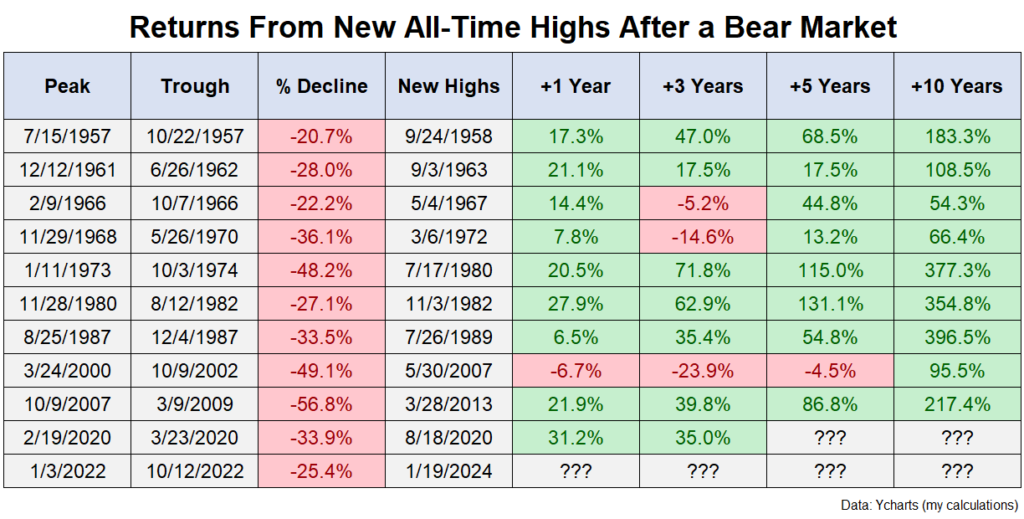 The chart below illustrates historical Bear Market declines for the S&P500 and following recoveries once a new all-time high was eventually achieved. On January 19, 2024 a new high was recorded following the Bear Market of 2022.