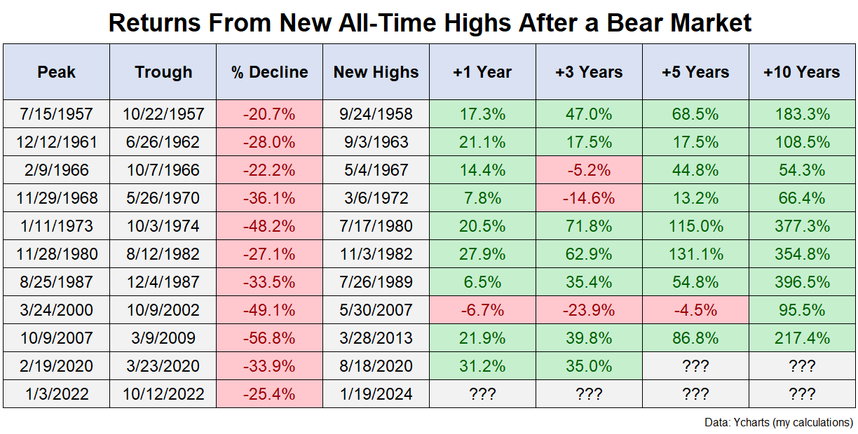 The chart below illustrates historical Bear Market declines for the S&P500 and following recoveries once a new all-time high was eventually achieved. On January 19, 2024 a new high was recorded following the Bear Market of 2022.